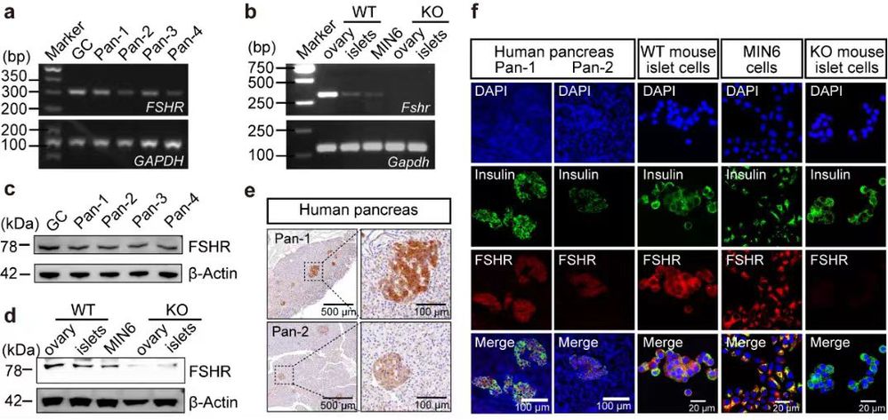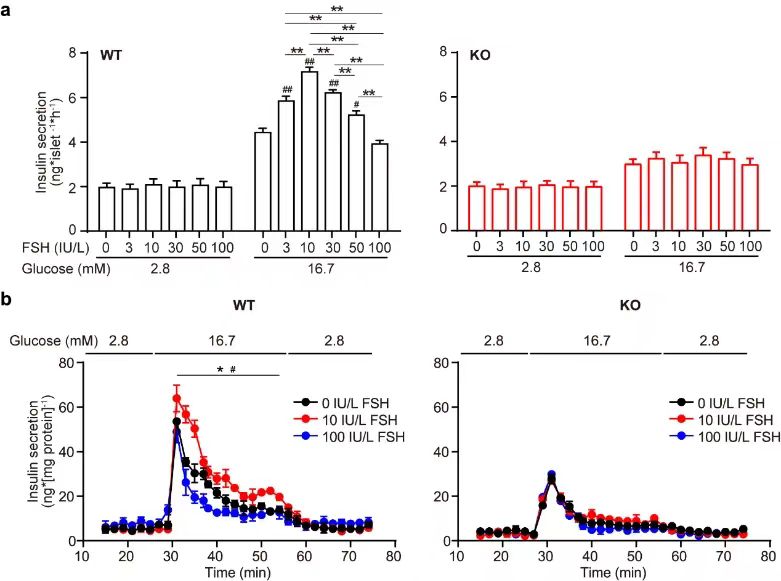 研究人员从mRNA和蛋白水平多层面首次证实了在人和小鼠的胰岛β细胞中表达FSHR。根据女性不同生理阶段血清FSH水平,设定从0~100 IU/L不同的FSH浓度进行胰岛体外实验,发现FSH刺激并不直接影响胰岛素的分泌,但FSH可协同葡萄糖刺激胰岛素分泌。这种协同效应呈现钟型曲线效应:低浓度FSH(0-10 IU/L)以剂量依赖性的方式促进葡萄糖刺激胰岛素分泌(Glucose-stimulated insulin secretion, GSIS),高浓度(>10 IU/L)FSH以剂量依赖性的方式降低GSIS。敲除小鼠胰岛或敲降MIN6细胞上的FSHR时,FSH对于GSIS的调节作用消失。研究人员进一步利用FSHR敲除和胰岛特异性FSHR敲除小鼠进行体内功能研究,发现阻断FSH/FSHR信号会诱导小鼠发生因胰岛素分泌不足所导致的糖耐量异常。研究数据显示FSH通过FSHR实现对GSIS的调节作用,而这种调节功能因FSH水平呈现“钟型曲线”效应。