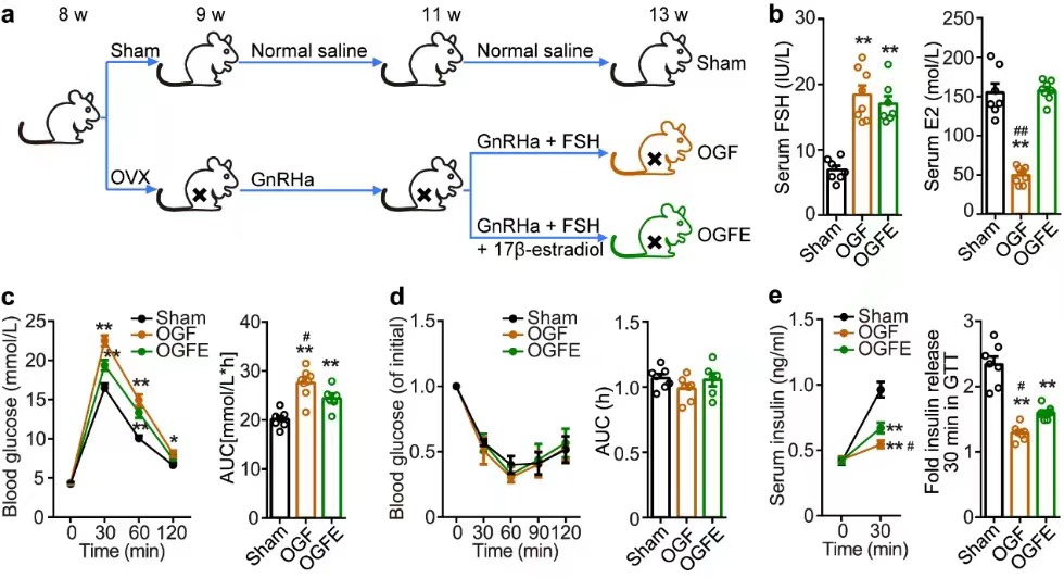 通过上述FSH对GSIS的调控模式,可以发现低浓度FSH(< 10 IU/L)对促进GSIS和糖稳态具有重要作用,而过高的FSH水平不利于糖稳态。在临床上,围绝经和绝经女性FSH水平急剧升高,甚至可达10倍以上。研究人员又进一步利用卵巢摘除小鼠模型模拟绝经状态,并通过雌激素补充的方法排除雌激素干扰,发现高水平的FSH诱导小鼠胰岛素分泌不足和糖耐量异常。这些结果均提示FSH对于维持机体糖代谢稳态具有重要作用,绝经期女性糖尿病发生风险增加很可能与体内急剧升高的FSH水平有关。这一发现为深入了解围绝经期女性糖尿病发病的分子机制和寻求潜在的药物靶点提供重要的科学依据。