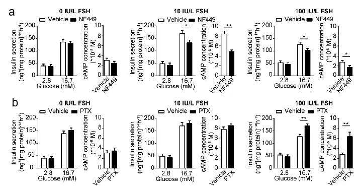 既往生殖细胞的研究发现,FSHR可通过偶联Gαs或者Gαi蛋白进行信号传递。研究人员进一步使用Gαs蛋白特异性抑制剂NF449预处理MIN6细胞,发现10 IU/L FSH组和100 IU/L FSH组细胞中cAMP含量、GSIS能力显著性降低,提示FSHR可能与Gαs蛋白偶联。使用Gαi蛋白特异性抑制剂PTX预处理MIN6细胞,发现仅100 IU/L FSH组细胞中cAMP含量和GSIS能力显著性升高,而0 IU/L FSH组和10 IU/L FSH组细胞中cAMP含量和GSIS能力无明显变化。通常情况下,GPCR通过偶联单一类型G蛋白的经典途径传递信号。而上述结果提示,胰岛β细胞FSHR可能同时与Gαs和Gαi蛋白偶联通过非经典信号途径调控GSIS,在低浓度FSH刺激下激活Gαs促进GSIS,高浓度的FSH同时激活Gαi减弱对GSIS的促进作用。