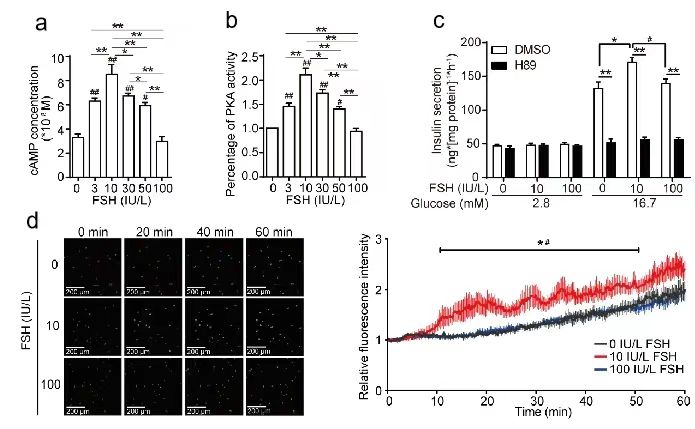 FSHR是经典的G蛋白偶联受体(GPCR),该类受体在胰岛β细胞中通过cAMP-PKA依赖性信号调控胰岛素颗粒出胞。为了进一步探究FSH对于GSIS调节机制,研究人员检测了在高糖条件下,不同浓度FSH刺激下MIN6细胞内cAMP含量及其下游PKA蛋白的活性,结果显示低浓度FSH(0-10 IU/L)以剂量依赖性的方式增加胞内cAMP含量及PKA蛋白的活性,高浓度FSH (>10 IU/L)以剂量依赖性的方式降低胞内cAMP含量和PKA蛋白的活性。PKA特异性抑制剂可以阻断FSH对于GSIS的调节作用。此外,在高糖条件下,10 IU/L FSH处理组的MIN6细胞胰岛素分泌水平以及细胞内钙离子水平显著高于0 IU/L FSH组和100 IU/L FSH组,而使用细胞膜钙离子通道抑制剂verapamil后,细胞内钙离子水平均无差异。这些结果说明FSH调控GSIS的机制可能与cAMP/PKA信号通路以及胞内钙离子信号有关。