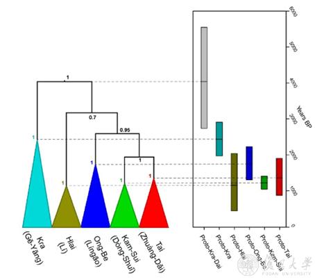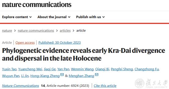 10月30日,复旦大学现代语言学研究院、复旦大学智能复杂体系基础理论与关键技术实验室张梦翰课题组、生命科学学院郑鸿翔课题组等多家单位合作研究成果以“Phylogenetic evidence reveals early Kra-Dai divergence and dispersal in the late Holocene”为题,在线刊发于《自然-通讯》(Nature Communications)。该研究聚焦侗台语及使用该语言的人群演化历史,联合了广西民族大学文学院、复旦大学中文系、复旦大学文物与博物馆学系、复旦大学生命科学学院等多家单位,以侗台语历史演变为切入点,揭示了早期侗台语在约4000年前于中国南方沿海地区分化并向外传播的演化模式,该模式与史前侗台语人群的迁徙、农业扩张活动以及气候变化密切相关。该项工作为东亚及东南亚人类史前史问题的探索提供了一个重要的视角。