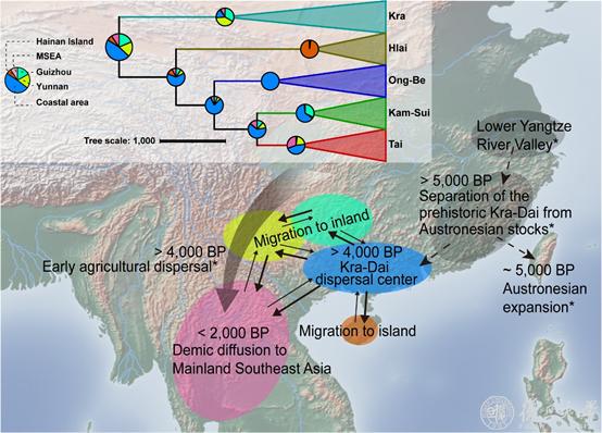 东亚和东南亚是世界上语言多样性最高的地区之一,不同语言群体之间有着广泛而密切的社会文化和遗传背景的联系。其中,侗台语语言及使用该语言的人群在这个地区的社会历史演化中扮演了重要的角色。为此,研究团队基于斯瓦迪士100核心词表(Swadesh list),收集并标注百种侗台语语言的词汇数据,构建了迄今最大规模的侗台语同源语素数据库。研究团队利用贝叶斯系统发生学方法以及谱系地理学方法,通过构建带有时间信息的侗台语语言谱系树,揭示了早期侗台语的分化发生在大约4000年前(图1),其地点最有可能位于我国的广西—广东地区(图2)。通过整合语言学、遗传学、考古学、古生态学和古气候学的数据,研究揭示早期侗台语的分化和扩散与全新世晚期全球气候变化影响的人群扩张和农业传播密切相关;结合考古学和古基因组的已有证据进一步推测出侗台语人群与南岛语人群共同来源于早期长江下游地区的水稻种植人群,即百越民族(图2)。