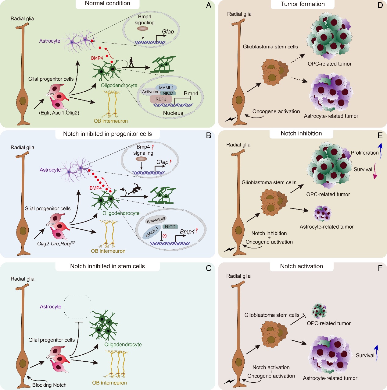 由于胶质细胞的发育过程主要由神经干细胞先产生多潜能前体细胞,再由这些细胞经历分化为特定的胶质类型。正常发育过程中,神经干细胞可以产生星形胶质细胞和少突胶质细胞两种类型。该研究首先在神经干细胞中敲除Rbpj基因(经典Notch信号必须)阻断Notch信号发现,当神经干细胞缺失Notch信号后,其产生的子代胶质细胞只有少突胶质一种类型,提示Notch是星形胶质细胞发育的关键决定因子。当在多潜能前体细胞中阻断Notch信号后发现两种胶质的产生不受影响,但是少突细胞的发育进程加快。深入探究发现,少突胶质细胞在髓鞘形成时会释放Bmp4信号至星形胶质细胞,促进其上调Gfap的表达,此路径可能有助于星形胶质细胞为其提供髓鞘化时必须的营养物质,从而支持其加速发育。与此类似的是,当在以少突细胞为主的胶质瘤亚型中缺失Notch信号后,肿瘤的进展也会加速。鉴于Notch信号在早期对胶质亚型的调控作用研究人员通过敲除和过表达实验证实在胶质瘤发生过程中Notch对其亚型的发生起到了关键的调控功能。总之,该研究将胶质发育同胶质瘤的发生发展相联系,揭示了Notch在其中发挥了重要的调控功能,为胶质瘤的发生和治疗提供了一定的理论指导。
