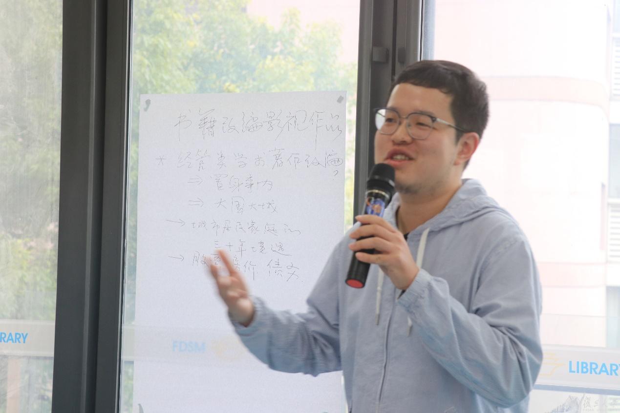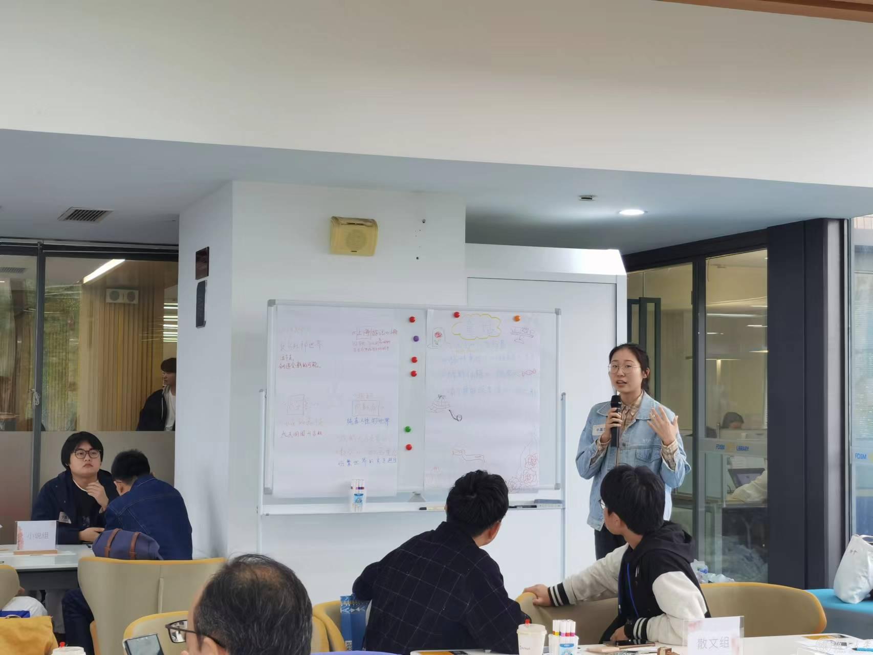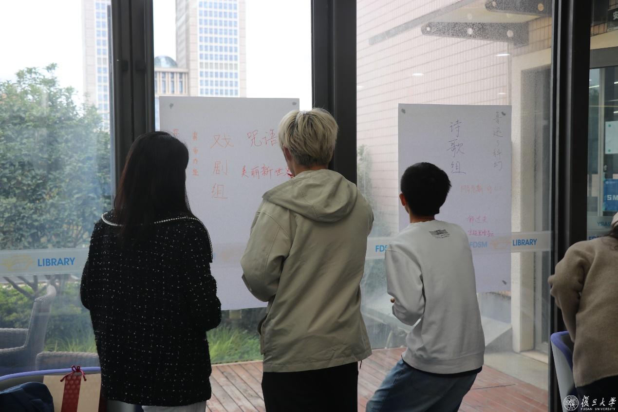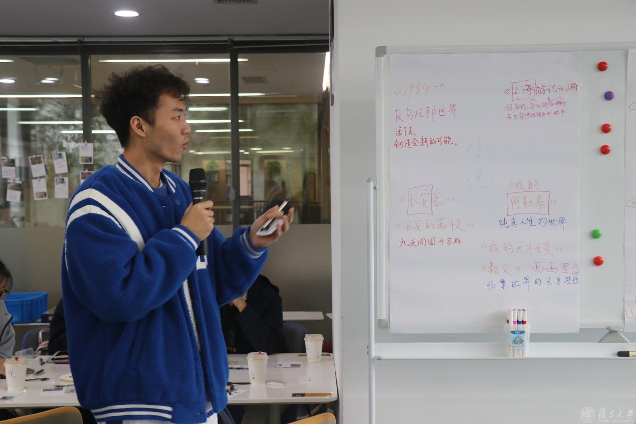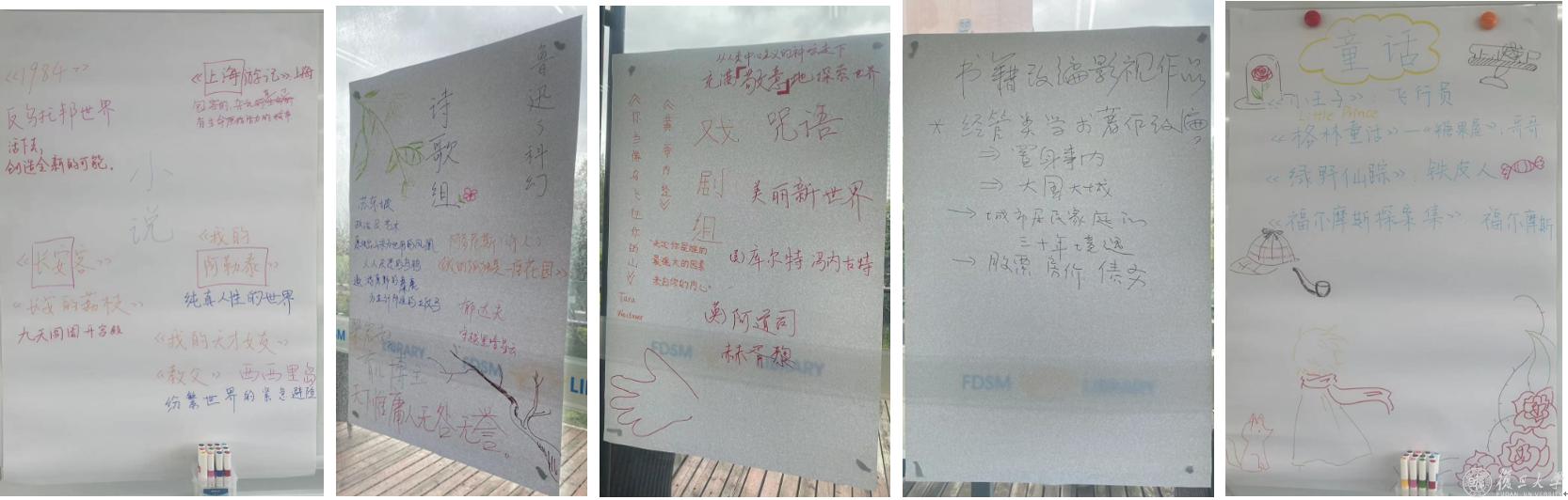 活动中,在场同学根据卡片分为五组,分别根据上述五个话题分享自己的阅读心得。经过短暂、热烈的分享和讨论,小组成员在心仪卡片中写上相应主题的推荐书目和感悟,并把讨论结果展示在各组的白纸板上,每组选派一位代表阐释白纸内容。