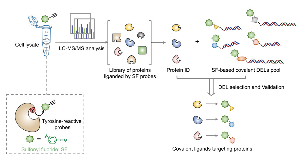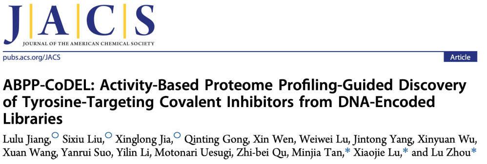 近日,复旦大学药学院周璐教授团队联合中国科学院上海药物研究所陆晓杰研究员团队和谭敏佳研究员团队,开发了一种整合ABPP(activity-based protein profiling)- CoDEL技术的共价配体筛选新方法。该项工作以《ABPP-CoDEL:基于活性蛋白质组学指导的DNA编码化合物库筛选技术发现酪氨酸靶向的共价抑制剂》(ABPP-CoDEL: Activity-Based Proteome Profiling-Guided Discovery of Tyrosine-Targeting Covalent Inhibitors from DNA-Encoded Libraries)为题在线发表于《美国化学会志》(Journal of the American Chemical Society)。