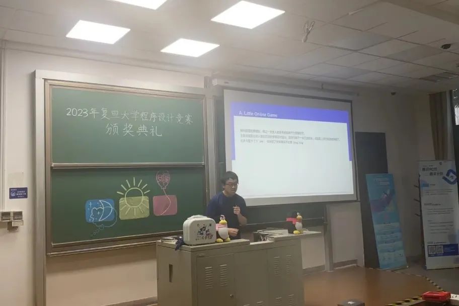 总决赛参照 ICPC(国际大学生程序设计竞赛)规则进行,比赛过程中参照正式 ICPC 比赛的惯例为选手们发放象征着 “AC(通过题目)” 的气球,即每通过一题,发放题目对应颜色的气球。这样既活跃了现场的气氛,也鼓励同学们通过更多的题目。复旦大学程序设计竞赛队承担了本次比赛的赛事组织、命题、评测系统和网站等各项技术支持工作,保证了比赛的顺利举行。李佳骏同学代表出题组对本次题目进行了详细的讲解。此外,本次比赛还特别设置了滚榜环节,由聂绍珩同学负责滚榜,营造紧张刺激的比赛氛围,同时也让参赛选手们体会程序设计竞赛的魅力