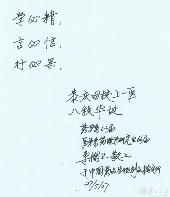 上医八秩华诞,他为母校亲笔题词“学必精、言必信、行必果”。2008年岁末,他致信上医北京校友会联谊会,鼓励上医人用知识和技能为国家发展贡献自己的全部力量。他在信中说:“81年来,母校形成的传统和精神,渗透到我们每个学子身上。‘为人群服务’的校歌,‘正谊明道’的校训,始终激励着我们,鞭策着我们,用我们的知识和技能,为国家的发展贡献自己的全部力量。”