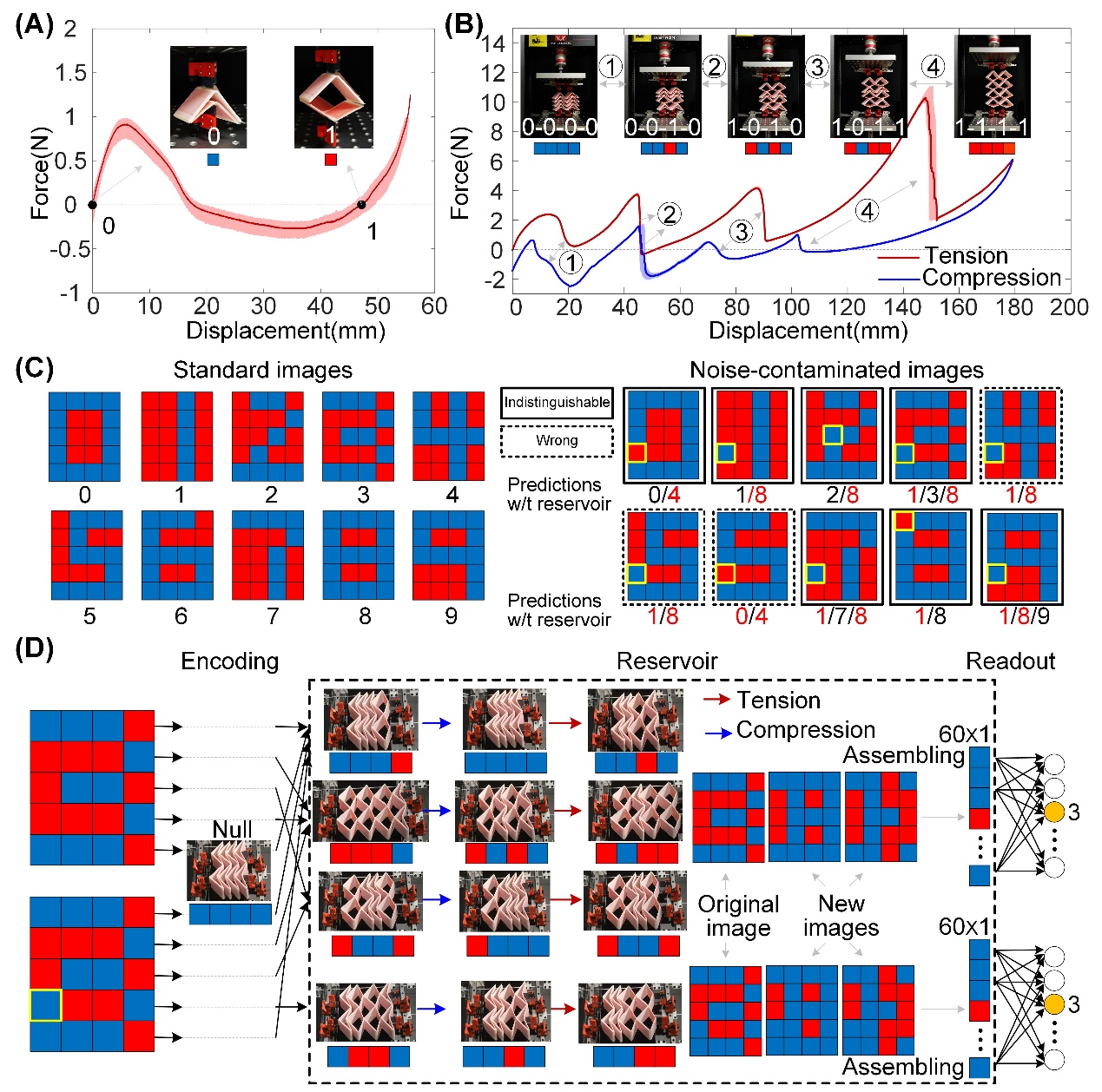 元胞自动机是一种图灵完备的离散计算范式,可以用于模拟各种复杂系统的演变过程。该工作首先揭示了元胞自动机和多稳态折纸超材料的相似性:即都是由离散胞元构成,每个胞元具有二进制的稳定状态,这些状态在预定义的规则下可以被改变,形成切换序列,并且具有在不同维度空间的拓展能力(图2A)。基于此,模仿元胞自动机的储备池计算,提出了基于多稳态折纸超材料的新型机械计算框架(图2B),该框架将特定任务编码进多稳态折纸超材料的稳态构型,通过外力作用实现稳态构型切换,以多稳态切换序列作为储备池输出计算结果。