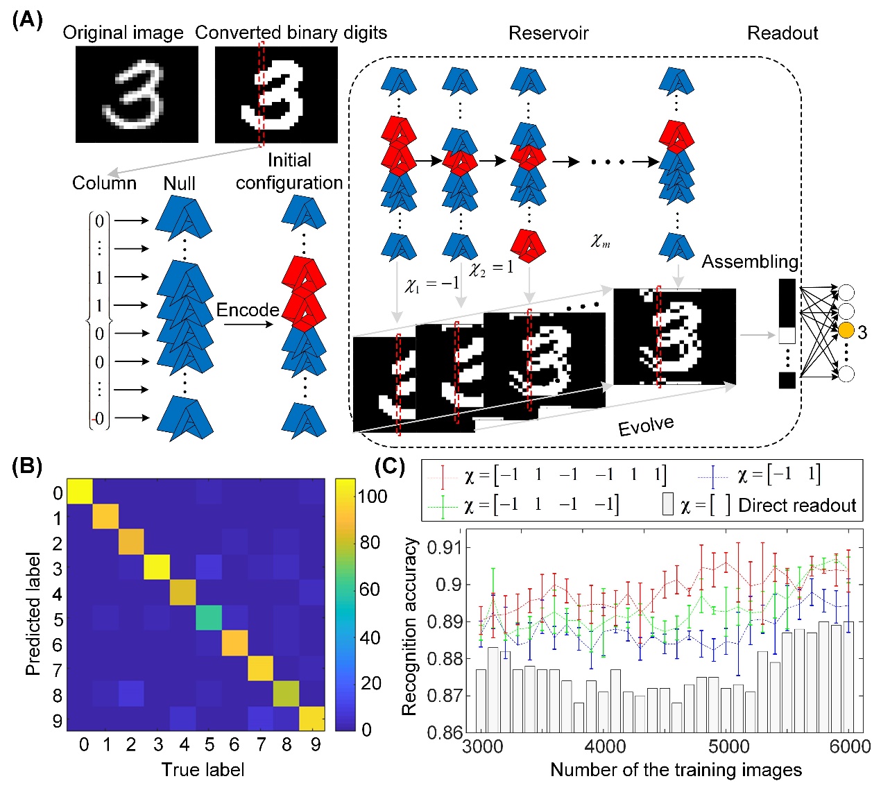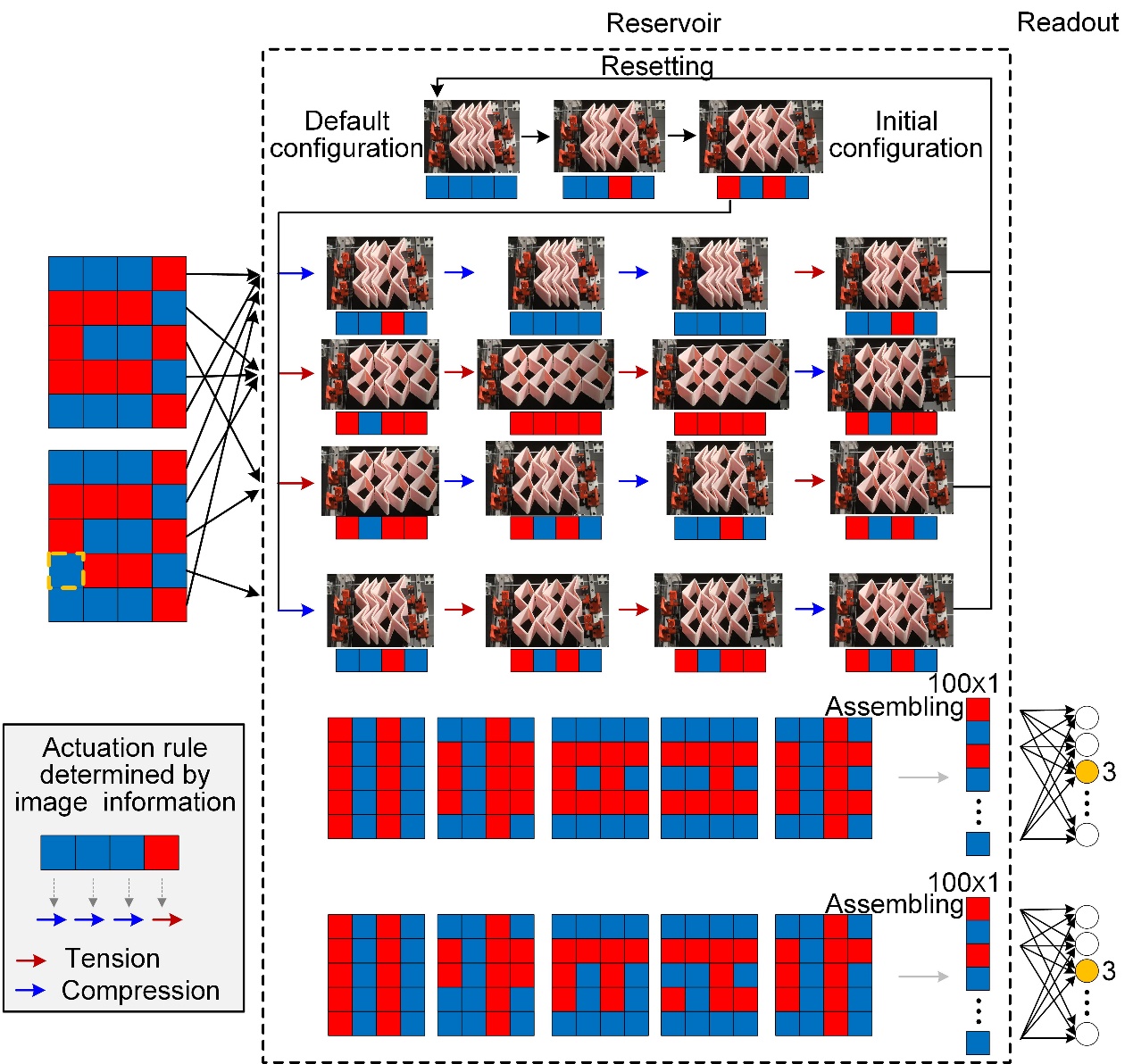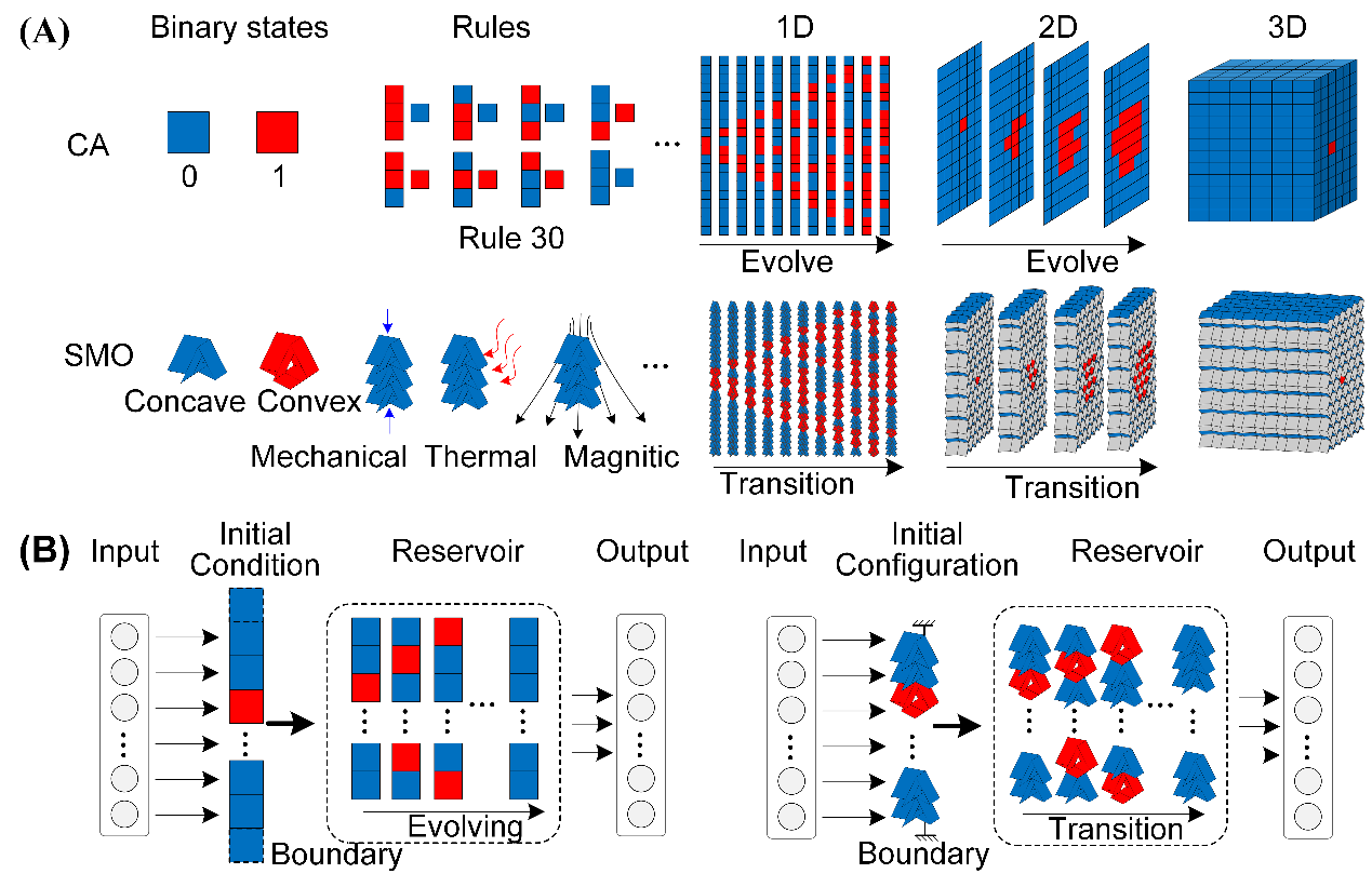 复旦大学方虹斌教授团队和美国密歇根大学Kon-Well Wang教授团队提出了一种通过多稳态折纸超材料进行机械学习的创新方法。该方法受元胞自动机启发,以多稳态切换序列作为储备池,实现了包括数字辨识、手写图像识别和时序记忆等复杂计算任务。