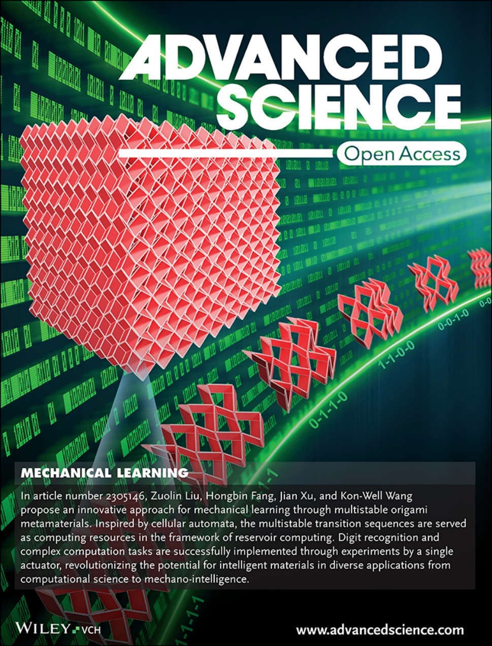 日前,复旦大学工程与应用技术研究院方虹斌教授团队首次提出了元胞自动机启发的多稳态折纸超材料机械计算新框架。该框架以折纸(origami)超材料为平台,结合了储备池计算和多稳态构型切换,成功实现了数字图像识别、手写图像识别和时序记忆等复杂计算任务。这标志着在开发具有先进计算能力的新一代智能材料方面取得了重大进展。2023年12月7日,相关研究以“Cellular automata inspired multistable origami metamaterials for mechanical learning”为题发表在国际综合性期刊《先进科学》(Advanced Science),并被遴选为卷首插图(doi: 10.1002/advs.202370236)(图1)。