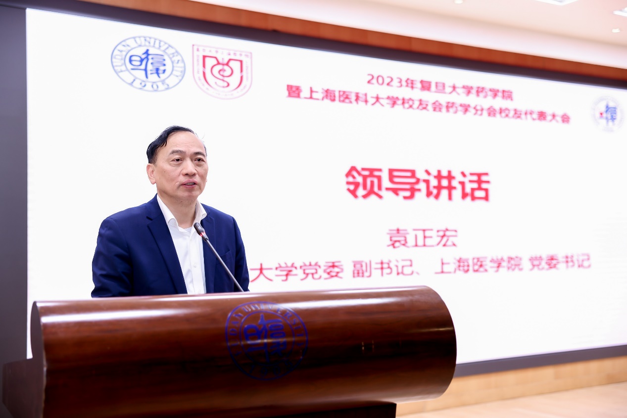 袁正宏从治理体系、学科建设、人才培养、师资队伍、科技创新、医疗服务、国际交流和办学支撑等方面向校友们详细介绍了复旦上医取得的成果,以及面向新征程,复旦上医在努力建成具有全球影响力和鲜明复旦特色的国际一流医学教育、科研、人才和临床医疗中心方面的规划举措。他结合面向上医百年和药学院创立九十年,对药学院校友工作提出了三点期望:一是要深入涵养校友文化,助力上医百年;二是要广泛汇聚校友资源,助力母校发展;三是要悉心做好服务保障,增强校友的获得感与融入感。他表示,校友永远是母校最好的名片,母校将永远当好校友们的娘家人、大后方、连心桥,畅通校友参与学校建设与发展的渠道,把宝贵的校友资源转化为优质的办学资源,增强校友对母校事业的融入感,共同为建设世界一流大学和一流医学院努力奋斗。