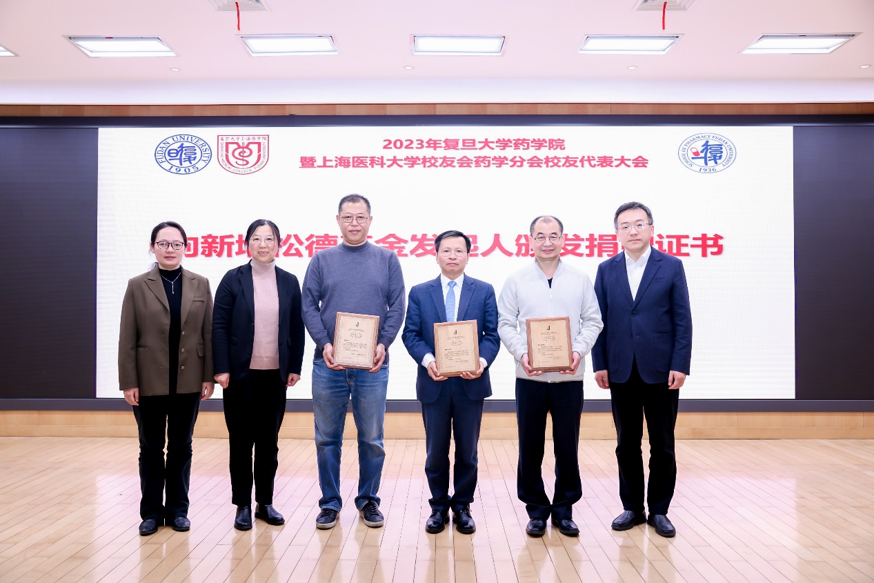 徐军、医学党政办主任许晓茵、恽小婧向松德基金新增捐赠人代表83级校友汤兴斌、87级校友姚新根和91级校友吴超颁发了捐赠证书。
