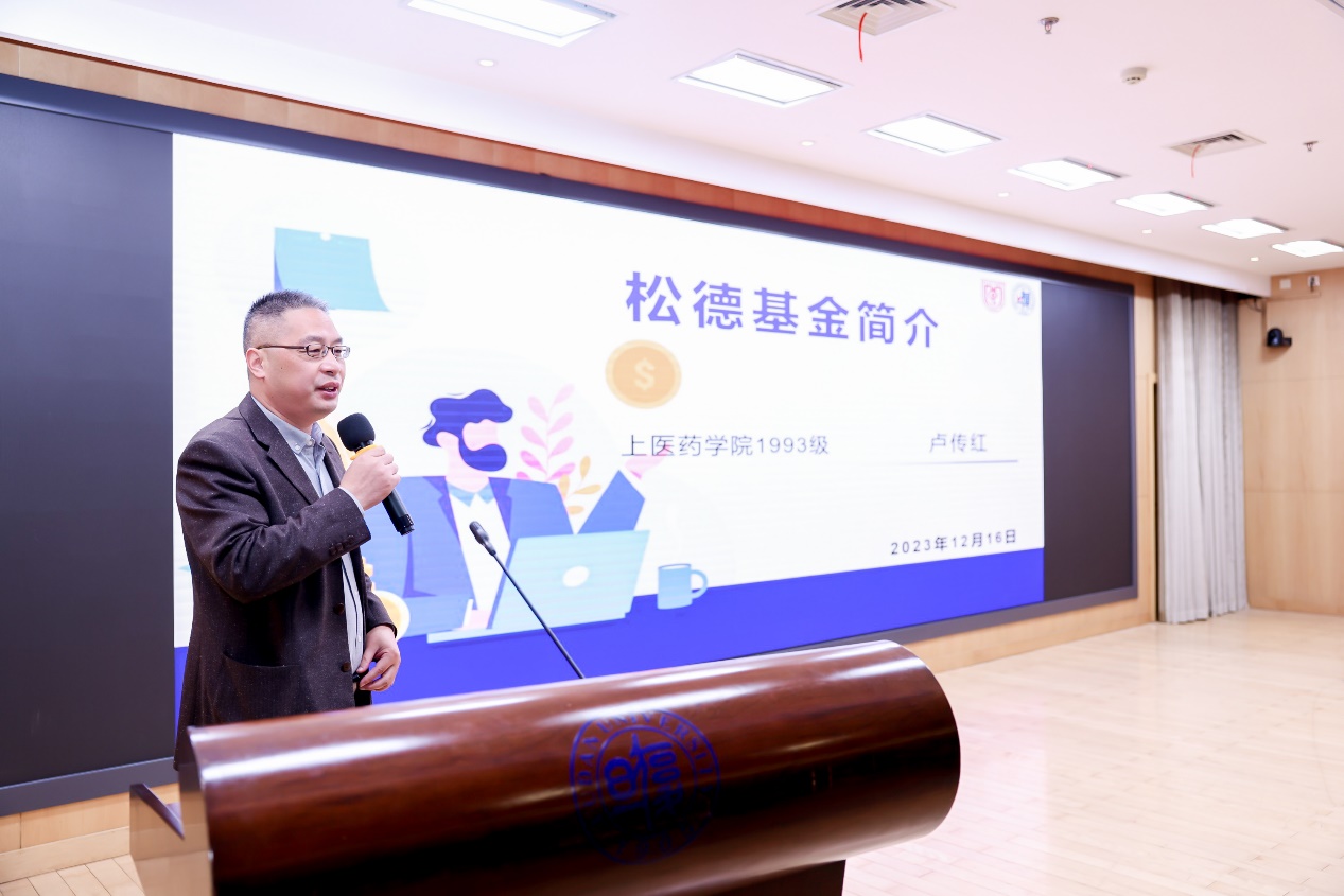 随后,复旦大学药学院松德基金首批发起人之一、药学分会副会长、药学院1993级校友卢传红向与会人员介绍了松德基金项目的发起目的、运行方式等情况,他表示松德基金不仅为优秀贫困学生完成学业提供了保障,更传承了上医药学人回报母校、服务人群的精神,期望更多校友加入,“使吾国药学人才日渐发达”。