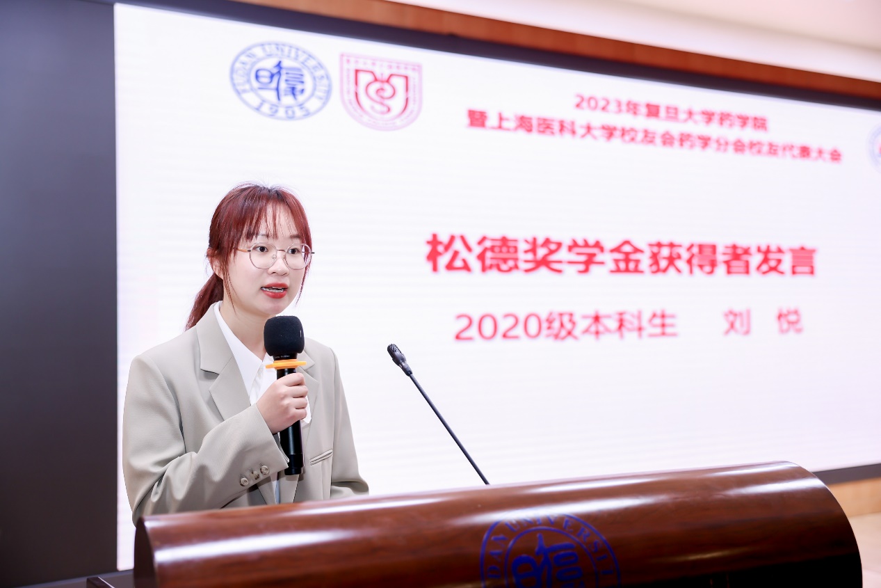 药学院2020级本科生刘悦和2022级博士生李启秀代表获奖学生发表感言。刘悦表达了对爱心校友和学校老师最诚挚的谢意,表示未来会继续努力,夯实学业基础,用实际行动回馈学院、回馈学校,为社会的医药健康事业的发展贡献绵薄力量。李启秀在大一时就了解到药学院“松德堂”捐赠人项松茂先生的生平事迹,这使得她从那时起便立志要扎实学好专业知识,努力让自己成为可以为祖国药物研发事业添砖加瓦的药学人才,自己一路以来获得了许多前辈校友、老师们的帮助,未来也会不忘初心、挺膺担当。