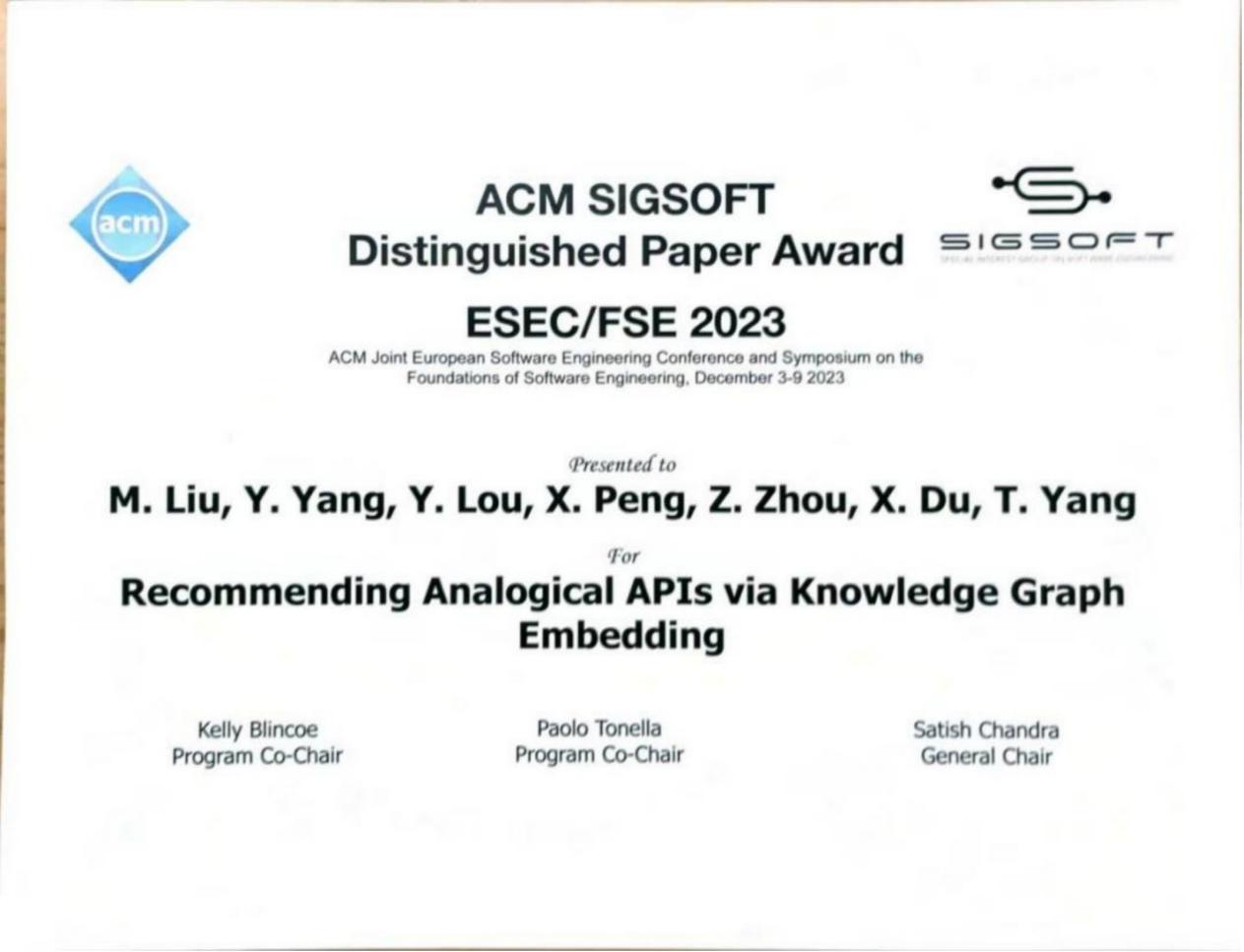 近日,复旦大学计算机科学技术学院CodeWisdom团队(复旦大学软件工程实验室)的研究论文“Recommending Analogical APIs via Knowledge Graph Embedding”在美国旧金山举办的国际会议ACM Joint Meeting on European Software Engineering Conference and Symposium on the Foundations of Software Engineering (ESEC/FSE 2023)中获得杰出论文奖(ACM SIGSOFT Distinguished Paper Award)。
