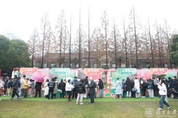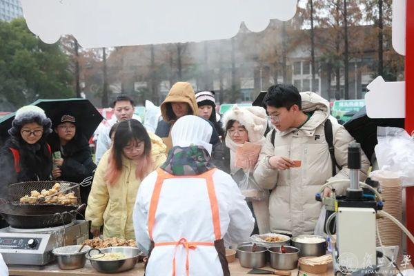 早晨8点多,光华楼东草坪各个美食摊位准备就绪,新鲜的食材等待烹饪,现炒的美味带来冬日满足。展览启动仪式前,师生们已在各个摊位前排起长队。