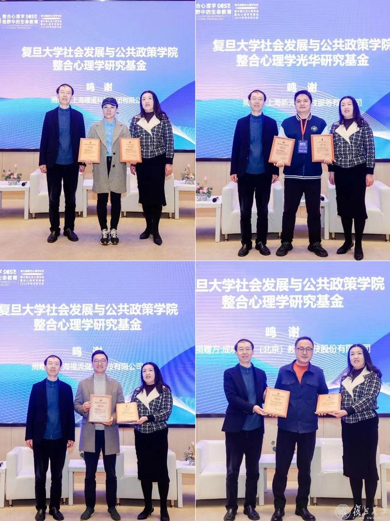 鸣谢授牌仪式上,社会发展与公共政策学院党委书记尹晨和上海复旦大学教育发展基金会副秘书长、对外联络与发展处副处长陆颖丰共同为“社会发展与公共政策学院整合心理学研究基金”的捐赠方上海福流健康科技有限公司、上海新光华科技服务有限公司、上海曜遥科技集团有限公司以及成功之道(北京)教育科技股份有限公司颁发捐赠证书,并赠予感谢函。该基金将用于复旦大学心理研究中心的整合心理学研究,由彭希哲,尹晨,孙时进三位教授组成项目管理小组,负责人为孙时进。