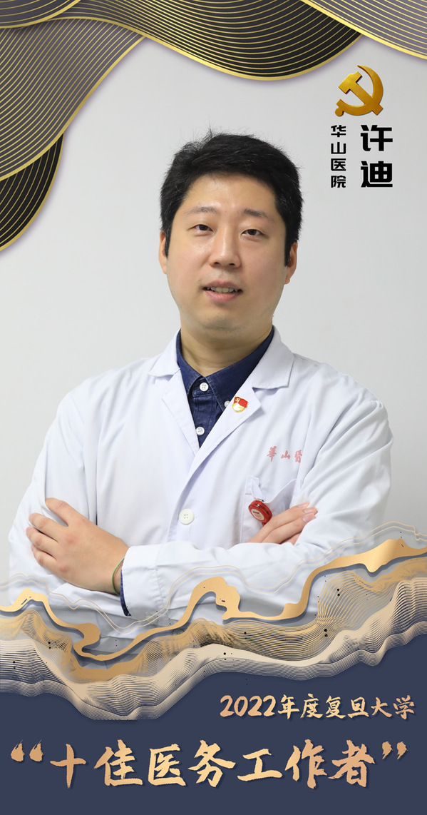 许迪,中共党员,卫管研究实习员,现任复旦大学附属华山医院宝山院区保卫科副科长。2022年3月至6月根据上级和院领导部署,宝山院区设为新冠定点收治医院,迅速切换定点医院安保模式,坚守医院一线持续作战。疫情常态化防控期间,严格按照医院防控手势,从外围到楼宇,利用人防、技防、物防手段,做好管控工作。曾荣获2019年上海市医务职工安全生产知识竞赛优胜奖、2021年华山医院北院“爱岗敬业之星”、2022年宝山区反恐怖主义工作先进个人。