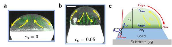 液滴内部的流场揭示了“自发升高”的物理机理。对于纯水液滴,由于气/液界面温度梯度的存在(如图1右侧所示),会在气/液界面处产生向下的热Marangoni流动,在液滴中心产生向上的流动,如图2a所示。但对于二元液滴,出现反向的流场,即气/液界面处是向上的流动,而液滴中心是向下的流动,如图2b所示。