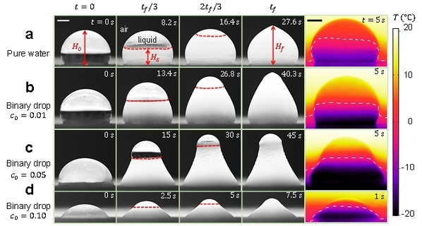 对于纯水液滴结冰来说,由于水从液态转变为固态过程中的体积膨胀效应,会在结冰最后阶段形成锥状突起,如图1a所示,但在整个结冰过程中,冰-水分界线(红色虚线)附近的气/固界面和气/液界面保持连续。而对于二元液滴结冰的情况,冰-水分界线附近的气/固界面和气/液界面存在明显的转折,如图1b-d所示,且最终时刻液滴高度可以达到初始高度的2倍以上,远远超过纯水液滴结冰情况。