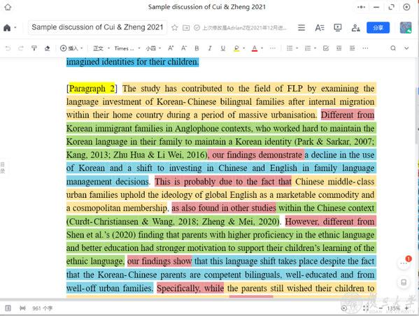 充分利用线上平台签到、投票、随堂测试的功能,帮助同学理解学习要点。不会区分论点、论据?在分析好文章时,郑咏滟利用线上文档实时编写功能,以不同颜色区分,形成“文本针织毯”,解决学生的难题。