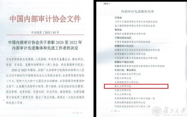 复旦大学审计处荣获“2020至2022年全国内部审计先进集体”荣誉称号,是继2014至2016年之后再次获得荣誉,受到表彰。