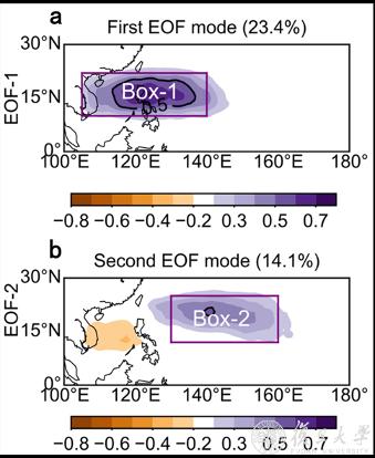 ENSO年西北太平洋台风模拟的不确定性。EOF前两模态表征的模式模拟台风的不确定性。第一模态方差贡献为23.4%;第二模态方差贡献为14.1%。