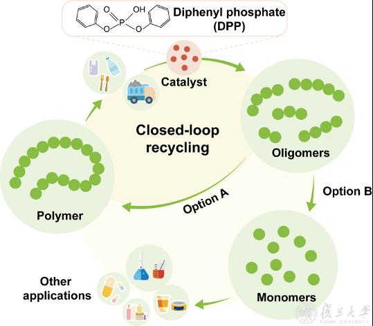 12月23日,高分子科学系俞麟教授首次将一种廉价的有机非金属化学物——磷酸二苯酯(DPP)用于加速PLA的水解并实现了材料的闭环回收。无需惰性气体保护、施加外部压力以及使用有机溶剂,仅在3.5 wt%的DPP和少量水的作用下,多种PLA工业粒料和市售产品在160 ℃下、1.5小时内可通过随机水解迅速转化为分子量不足500 g/mol的低聚物。相关研究成果以“Cheap organocatalyst diphenyl phosphate for efficient chemical recycling of poly(lactic acid), other polyesters and polycarbonates”为题发表于Chemical Engineering Journal。