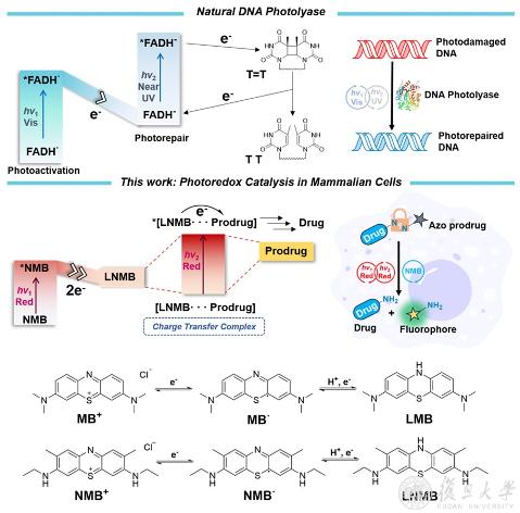 12月11日,化学系胡可青年研究员及合作成员受自然界中天然光酶(DNA光裂合酶)修复受损伤DNA机制的启发,提出光催化剂逐次累积红光光子能量以达到高能激发态的策略,实现红光催化裂解偶氮键,并成功应用于乏氧细胞内的红光生物正交偶氮前药激活。该研究成果以“Nature-Inspired Photocatalytic Azo Bond Cleavage with Red Light”为题在线发表于J. Am. Chem. Soc.。