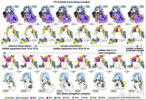 12月22日,生物医学研究院徐彦辉课题组在Science杂志上在线发表题为“Structural visualization of transcription initiation in action”的研究长文(Research Article)。该项研究首次用结构重现出了转录从头起始的16个连续动态全过程,揭示了通用转录因子(GTFs)和转录泡协同RNA聚合酶Pol II调控转录起始向转录延伸转变的分子机制。