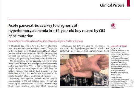 12月9日,The Lancet第402卷的clinical picture模块刊登了附属儿科医院消化科黄瑛教授团队的临床病例文章“Acute pancreatitis as a key to diagnosis of hyperhomocysteinemia in a 12-year-old boy caused by CBS gene mutation。”该高同型半胱氨酸血症病例为全球罕见疾病,以急性胰腺炎作为主要表现而被发现、诊治的病例更屈指可数,该病例的发表具有相当重要的临床意义。