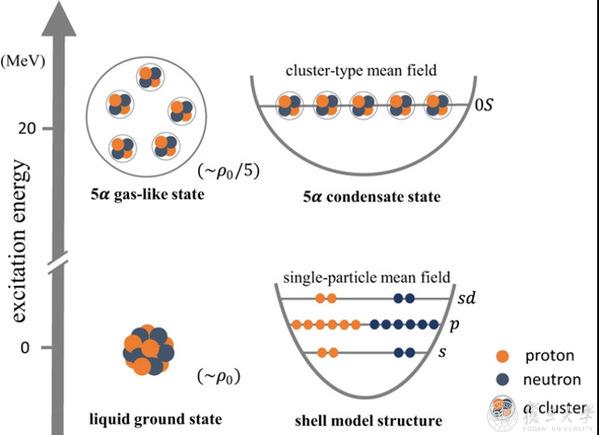 20Ne原子核的基态(单粒子运动为主)激发到5α凝聚态(?团簇运动为主)示意图(Nat. Commun. 14, 8206 (2023))