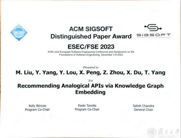 近日,计算机科学技术学院CodeWisdom团队(软件工程实验室)的研究论文《Recommending Analogical APIs via Knowledge Graph Embedding》在美国旧金山举办的国际会议ACM Joint Meeting on European Software Engineering Conference and Symposium on the Foundations of Software Engineering (ESEC/FSE 2023)中获得杰出论文奖(ACM SIGSOFT Distinguished Paper Award)。ESEC/FSE是CCF推荐的A类国际会议,也是软件工程领域的重要国际会议。本次举办的ESEC/FSE 2023是第31届大会,共吸引了470篇论文的投稿,最终录用127篇。