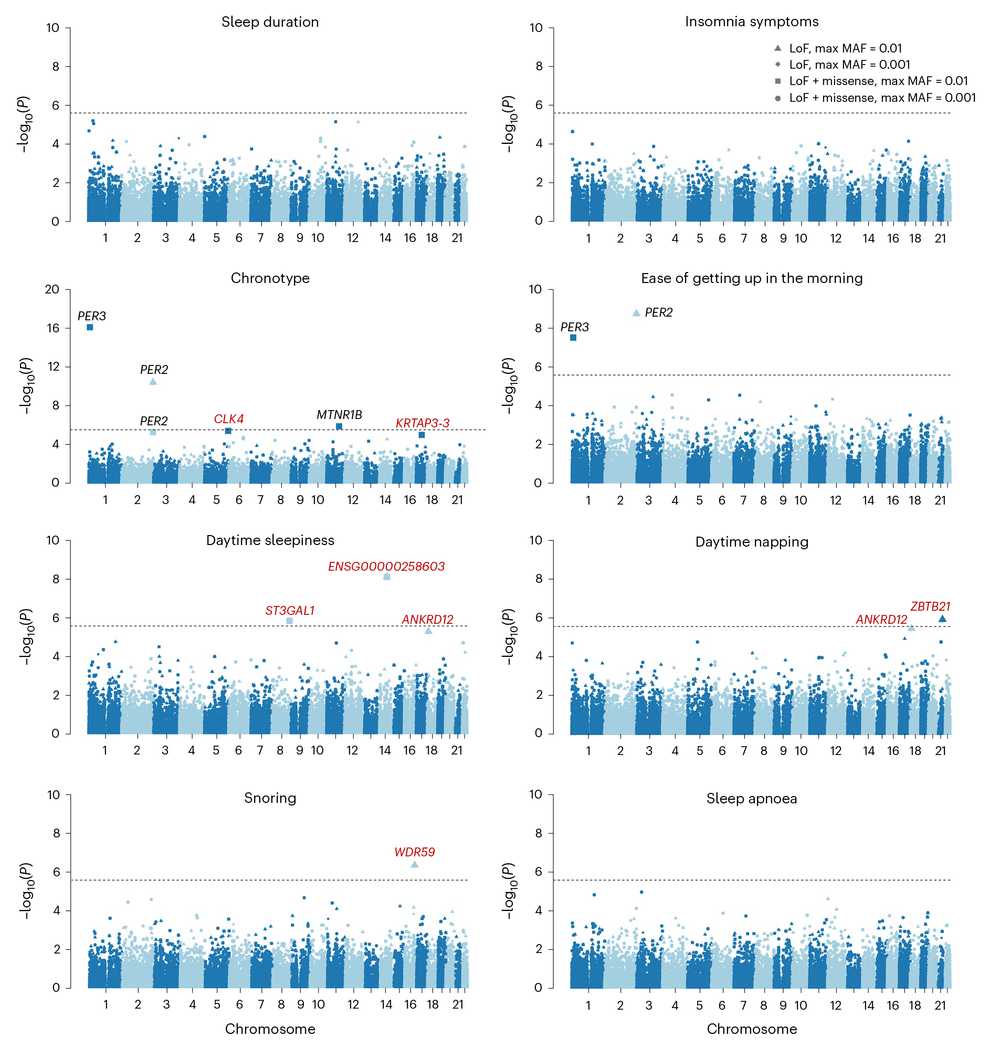 图2 罕见突变与八种睡眠表型的关联
