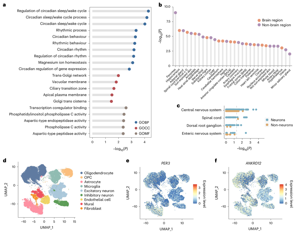 随后,研究团队探究了所发现基因的生物学功能。通过GO富集分析,这些基因富集于昼夜节律和调控昼夜节律的通路。其基因表达量则通过差异表达分析富集于胰腺、海马、肾上腺等组织。利用小鼠和人脑的单细胞测序数据,研究发现了这些基因在不同解剖部位和不同细胞类型中的表达模式,部分基因在中枢神经系统神经元中高表达。