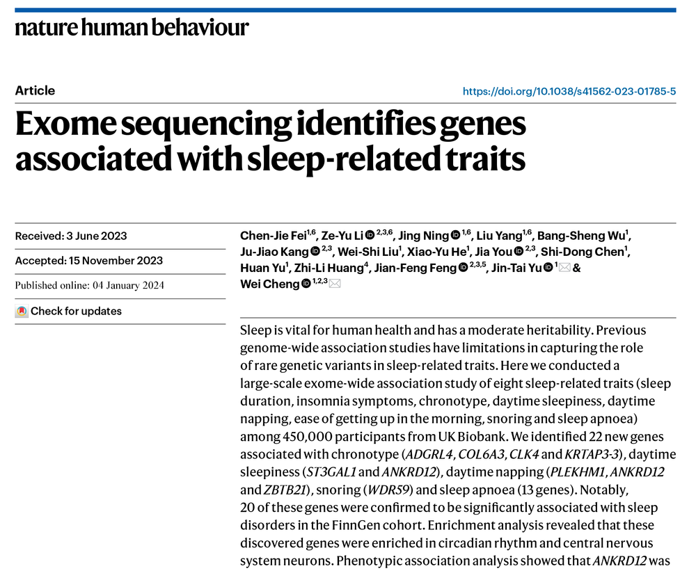 当地时间2024年1月4日,相关研究成果以“Exome sequencing identifies genes associated with sleep-related traits”(《外显子测序发现与睡眠相关表型关联的基因》)为题发表于Nature子刊Nature Human Behaviour。