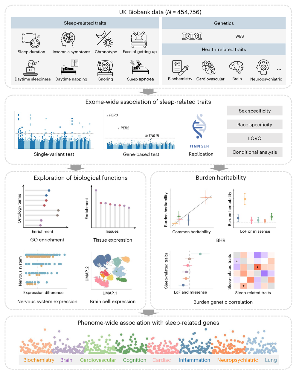 研究团队基于英国生物样本库(UK Biobank)近45万人的全外显子测序数据和睡眠表型数据,对睡眠持续时间、失眠症状、睡眠时间类型、白天嗜睡、白天打盹、早上起床是否容易、打鼾和睡眠呼吸暂停等八种常见睡眠表型进行了全外显子关联分析(Exome-Wide Association Study, ExWAS),共发现了68个与睡眠表型相关的基因,其中22个为新发现的基因。进一步在芬兰FinnGen数据库中进行了验证,并通过多种敏感性分析证实了其稳定性。