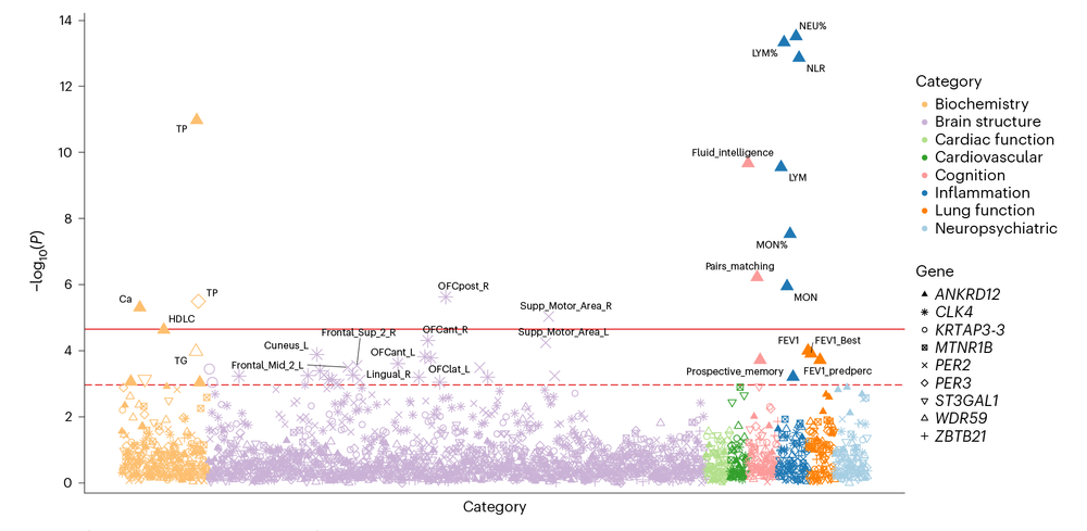 此外,研究还发现这些基因在与昼夜节律相关的通路中富集,且主要在中枢神经系统的神经元中表达。最后研究团队进一步探究了这些基因与生化、脑结构、心血管疾病、认知、心功能、炎症、神经精神疾病、肺功能等指标和疾病的关联。