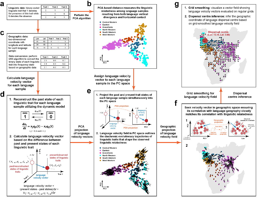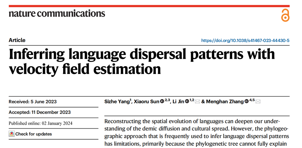 2024年1月2日,张梦翰课题组联合金力院士课题组在《自然-通讯》(Nature Communications)发表了题为“Inferring language dispersal patterns with velocity field estimation”的研究成果。该团队结合了跨学科的研究方法与理论,开发了用于推断语言扩散模式的新算法——语言速度场估计法(Language velocity field estimation)。该方法弥补了传统的谱系地理法的不足,可以在语言演化不符合谱系树的情况下,推断出语言的扩散中心和路径。运用语言速度场估计法,该团队探究了印欧语、汉藏语、班图语、和阿拉瓦克语的扩散中心与路径。研究结果显示,这些语言的扩散路径与从古DNA和考古材料推测的全新世人口迁移路径高度一致。此外,它们的扩散中心也与古代农业与新石器文化中心相吻合。这个研究结果说明了在过去的一万年里,语言扩散与人群扩张和文化传播紧密相连。这项研究成果不仅为语言扩散研究提供了新的视角和方法,还为理解人群活动和文化演化提供了重要依据。