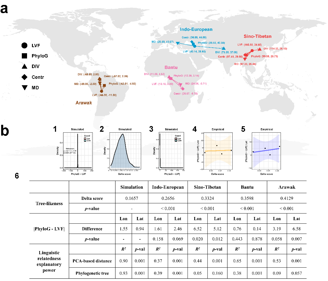 在过去一万年里,由于农业的发展,人类经历了大量的语言扩散、人群扩张和文化传播事件。考虑到人是语言的载体,而语言又是文化的载体,研究语言的扩散可以为探究人群活动和文化演化提供新的线索。语言扩散通常使用谱系地理法进行推断。这种方法假设语言的演化符合谱系树模型,并将随机游走运用于该谱系树上来推断祖先语言的地理坐标。然而,语言的演化受到大量的横向交流影响(例如语言借用和区域扩散),并不完全符合谱系树模型。因此,依赖谱系树的谱系地理法无法精确地重构语言扩散。如何不依赖于谱系树来推断语言的扩散成为了人类语言学研究中的一个重要挑战。