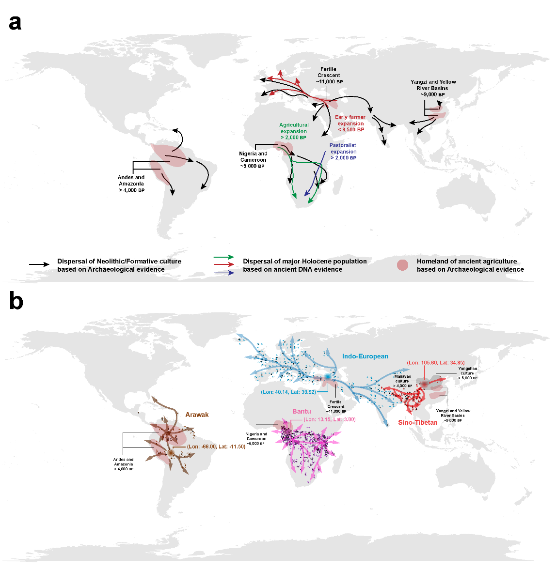 图2 世界范围内语言、人群、农业/新石器文化扩散路径与中心:(a)基于古DNA与考古证据推测的人群扩张和农业/新石器文化传播的路径与中心;(b) 基于语言速度场估计法推测的语言扩散的中心与路径