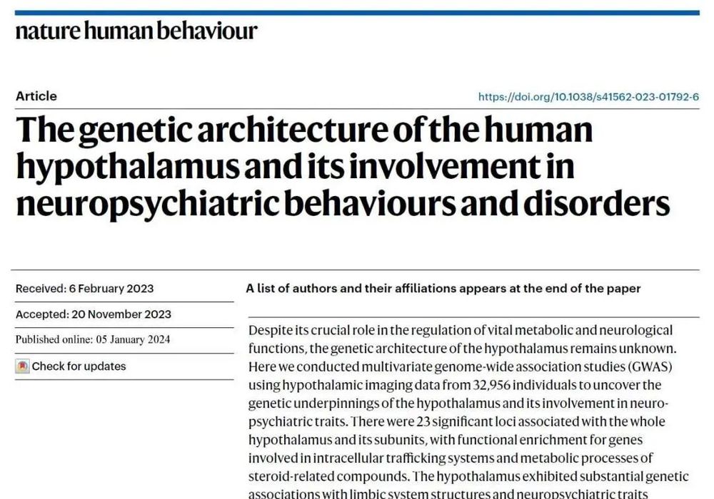 2024年1月5日,相关研究成果以“The genetic architecture of human hypothalamus and its involvement in neuropsychiatric behaviors and disorders”(《人类下丘脑的遗传结构及其与神经精神行为和疾病的关系》)为题发表于Nature子刊Nature Human Behaviour(《自然·人类行为》)。