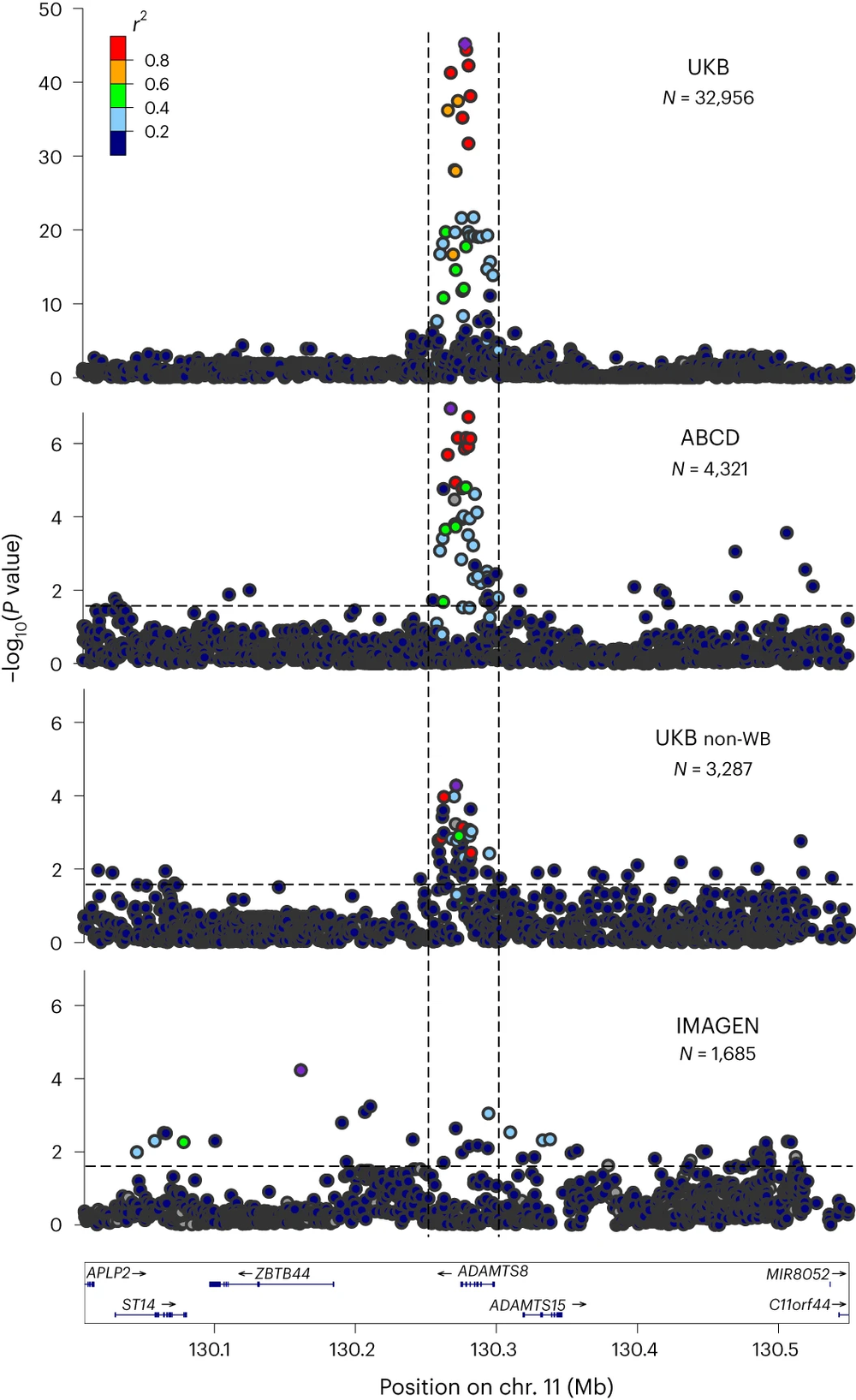 通过UKB中非英国白人人群,ABCD队列人群及IMAGEN队列人群,团队验证了上述GWAS结果中信号最强的ADAMTS8位点。荟萃分析后,ADAMTS8位点上遗传变异与下丘脑间的关联显著性进一步增强。孟德尔随机化分析表明更低水平的ADAMTS8表达与更大体积的下丘脑之间有潜在的因果关联。