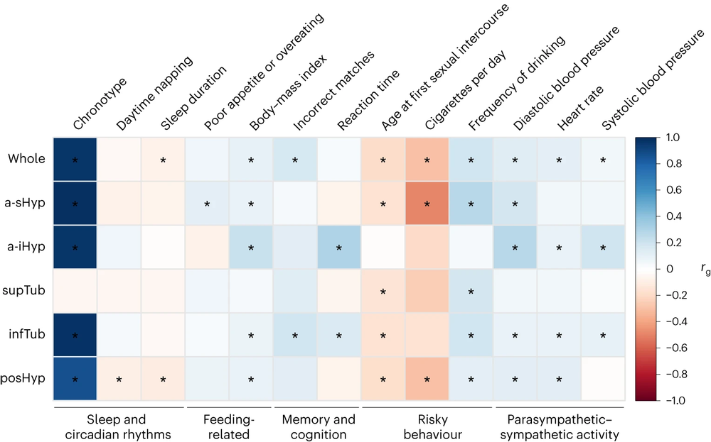 通过LDSC(连锁不平衡评分回归)和GCTA-GREML(全基因组复杂性状分析-基于基因组的限制性最大似然法)方法,研究团队发现了下丘脑与海马、海马旁回、基底前脑、伏隔、丘脑、苍白球、小脑、脑干、脑室等多个邻近结构存在显著的遗传相关性。同时,研究团队还分析了下丘脑和神经精神功能性性状的遗传关联,发现其与睡眠与节律、摄食、学习及认知、冒险行为、副交感神经/交感神经活动显著相关,具体指标包括了睡眠类型、睡眠时长、日间小睡、异常食欲、BMI(体重指数)、认知测试评分、首次性生活年龄、每日吸烟量、饮酒频率、血压、心率等。分析结果从结构和功能两方面为下丘脑和神经精神性状的关联提供了遗传学证据。