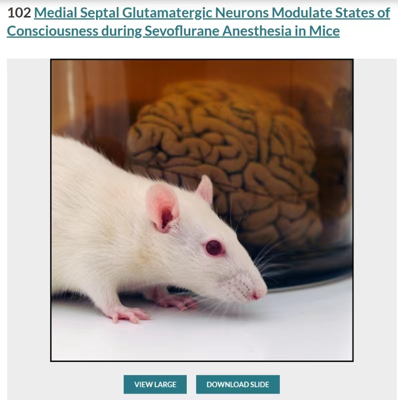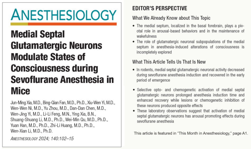 2024年1月1日,复旦大学附属眼耳鼻喉科医院麻醉科李文献/韩园课题组在麻醉领域期刊Anesthesiology上发表了题为“Medial Septal Glutamatergic Neurons Modulate States of Consciousness during Sevoflurane Anesthesia in Mice”的最新研究成果。课题组发现,位于基底前脑隔区的内侧隔核(Medial Septum,MS)中一类兴奋型神经元——谷氨酸能神经元调控七氟烷全身麻醉。该研究受到编辑和审稿专家的好评,入选为当月推荐文章“This Month in Anesthesiology”。