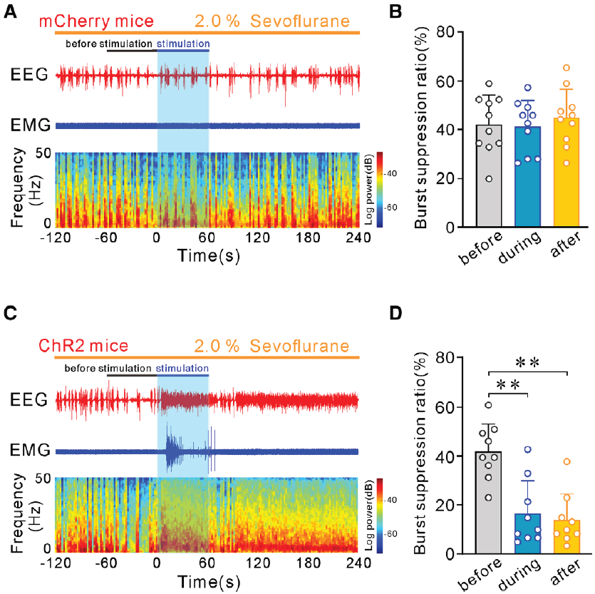 研究人员进一步通过提高七氟烷浓度诱导小鼠出现稳定至少5分钟的脑电爆发抑制波,此时再给予蓝光刺激,结果发现,小鼠依旧出现了明显的觉醒行为,并且脑电爆发抑制率显著下降。