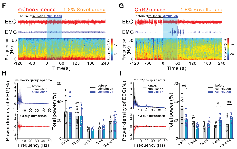 光遗传学方法可以对神经元活性进行精度更强且可逆的毫秒级操控。课题组进一步使用光遗传学方法研究了激活该神经元群体在麻醉稳定维持阶段对小鼠意识状态的影响。结合脑电肌电记录和行为学分析显示,使用473纳米蓝光特异性激活处于麻醉稳定维持状态中的小鼠MS谷氨酸能神经元,能迅速诱导大脑皮层活化和行为觉醒,脑电从低频高幅的慢波活动转换为高频低幅的脑电波形,δ波比例显著下降而β波、γ波比例显著增高,实验组小鼠普遍出现了翻正反射恢复甚至可以行走。