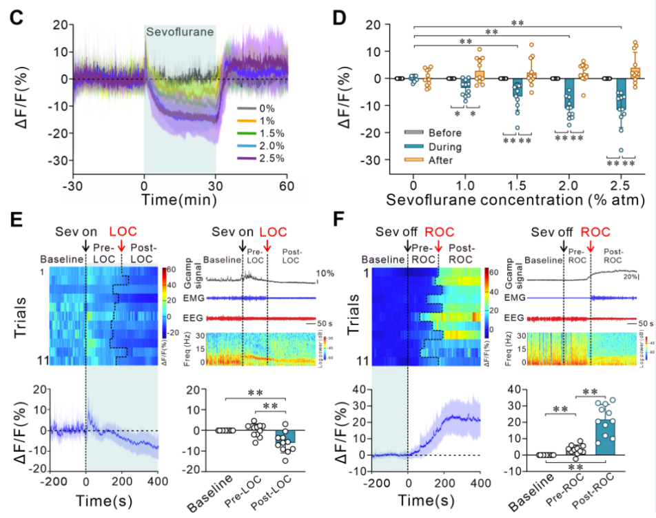 研究人员利用Vglut2-Cre小鼠,通过在体光纤钙信号和脑电肌电记录,发现内侧隔核谷氨酸能神经元群体的钙信号水平在暴露于七氟烷之后呈浓度依赖性下降,而关闭七氟烷之后,钙信号水平逐渐恢复。有意思的是,结合脑电肌电分析发现,在关闭七氟烷之后,该神经元群体的钙信号水平在苏醒早期、小鼠翻正反射恢复之前就已经显著上升,且在翻正反射恢复之后进一步增加。这提示MS谷氨酸能神经元可能促进了从麻醉到觉醒的意识状态转换,并且对麻醉苏醒后维持觉醒状态起到重要作用。