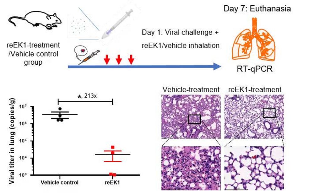 为了进一步探索reEK1在体内的抗病毒效果,研究者对hACE2转基因小鼠模型进行鼻腔雾化给药,试验结果表明reEK1可有效地预防SARS-CoV-2(BA.2)活病毒对小鼠的感染,显著降低小鼠肺部的病毒载量,从而改善肺部病理损伤,展现出良好的抗病毒临床应用前景(图3)。