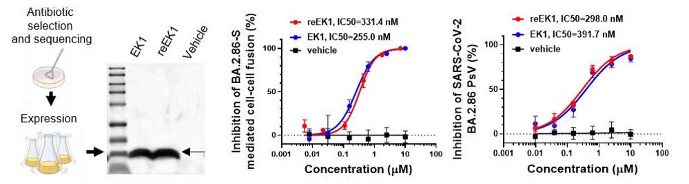 姜世勃/陆路团队在既往研究中发现,包含SARS-CoV-2在内的冠状病毒HR1结构域极其保守,阐明了靶向冠状病毒HR1是研发广谱抗冠状病毒多肽类抑制剂的关键机制(Lancet 2004; Nat commun 2014; Cell Res 2020),并依此成功开发了一系列广谱抗病毒多肽,如EK1、EK1C4等( Scie Adv 2019; STTT 2021; Cell Res 2022)。而在本研究中,该团队利用原核表达系统,研发出了广谱抗冠状病毒多肽reEK1及其重组原核表达工艺,为大规模抗冠状病毒药物储备提供了新方案。